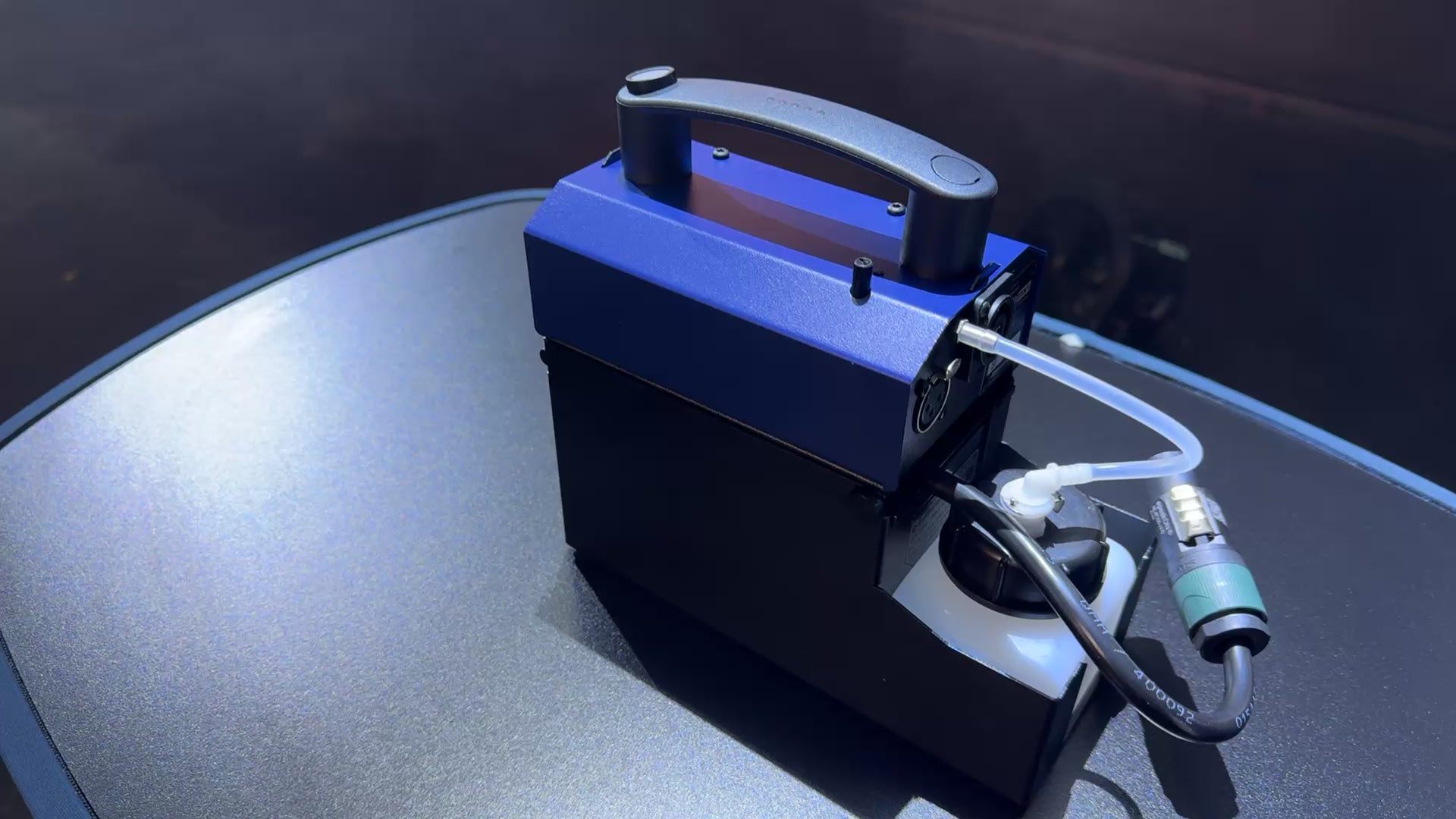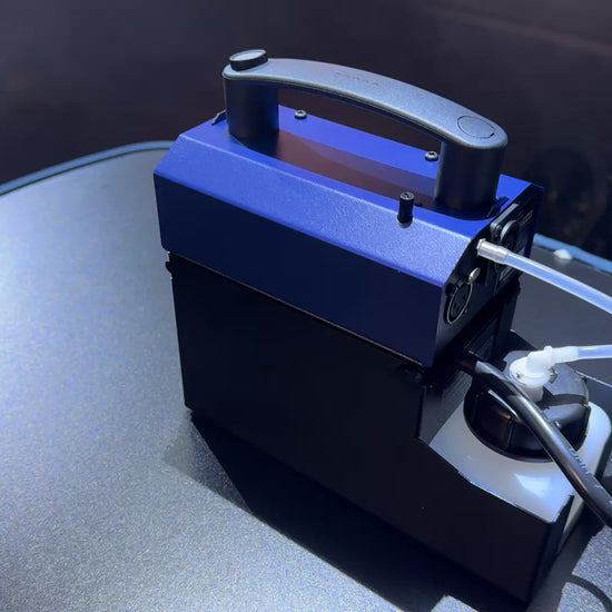 Off-mains operated hand held smoke machine, high flexibility and powerful fog output.